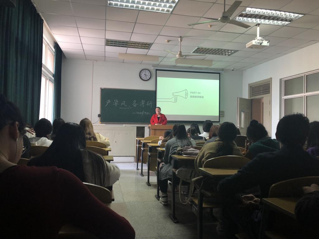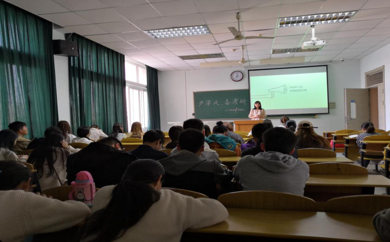 会议伊始,王薇薇老师就当前考研动机和方向选择上,向同学们介绍了考研的专业选择、“地缘”与报考院校选择等基本情况,并且分享了自己的备考指南。随后,刘建萍老师以“为什么要考研”作为开头,指出同学们应对自己合理定位,正确选择报考院校和专业。并且着重和同学们分享了考研过程中的学习方法。接着,罗威老师在分享了自己的考研备考经历后,提醒考研的同学们切忌三天打鱼两天晒网,要有持之以恒的付出和必胜的决心。既然做出考研的选择,就要好好对待,每个人都有不同的学习方法,要找准适合个人自身的方法,并做到高效有用。