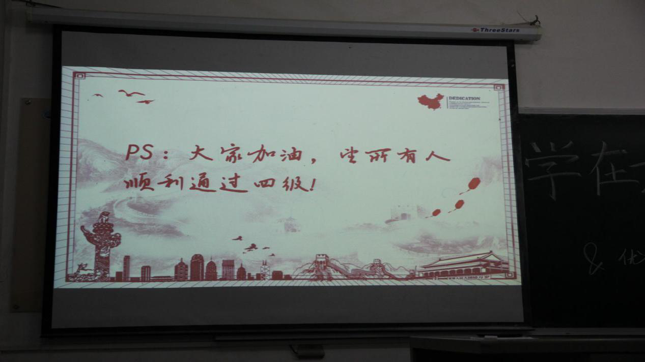 中文31802班邀请老师用PPT讲解英语四级考试题型。从“听力占比”以及“作文翻译”等内容来向同学们科普主要得分项,到“如何进行备战备考”问题的自由讨论,并请班上同学上台表达了自己对于“如何高效复习”的看法。班会在同学们热烈的掌声中圆满结束,“四级备考”主题教育深入每一位同学的心中。