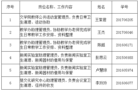 经个人申报、用人办公室审核,最终确定文学院2018年秋季勤工俭学学生人选,现将勤工助学学生名单公示如下: