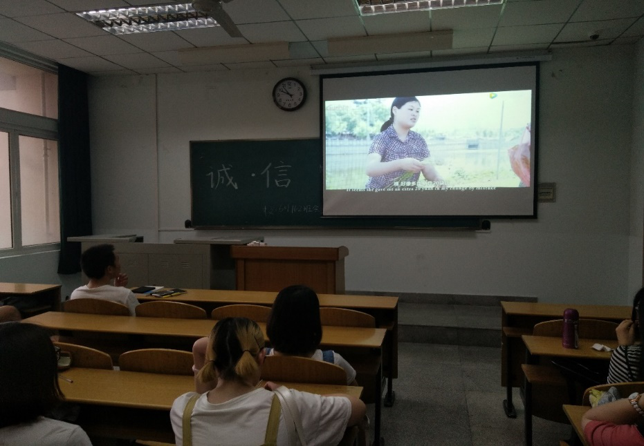 之后,全班集体观看视频《诚信》,这是根据真实事件改编的公益短片,旨在呼吁社会的诚信,视频通过一件找错钱的小事反映了当下社会人们对于诚信的态度。观看完视频后,中文11602班的李思源谈了自己的想法,她也希望大家能够讲诚信,特别是作为学委的她,告诫大家在今后的各种考试中,不要作弊,考出真实水平!最后,由中文11601班的班长谭翱总结发言,本次班会圆满结束。