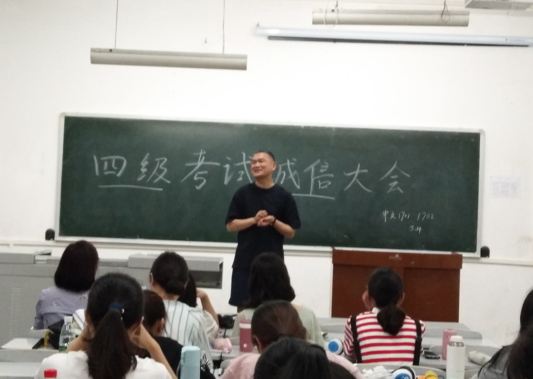 五月14日晚7点整,中文1701、1702开展了四级诚信考试宣誓大会。中文班的班主任龙厚雄老师,中文一班班长赵达两人以“诚信考试”为主题,为大家做了相关的介绍。 开始由赵达同学为大家做了一个简单的开场白,为大家讲了本周六的四级口语考试和六月四级考试的诚信问题。既在开始为大家动员,也强调考试的一个基本的诚信问题。