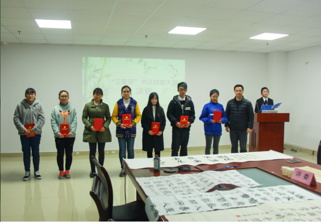 最后的颁奖仪式总是令人期待的,罗桥林荣获粉笔组三等奖,何柳、徐慧涵、李欢荣获硬笔组三等奖,赵雨轩、要慧妍、陈曦荣获软笔组三等奖;何柳荣获粉笔组二等奖,鲁雪怡、金辉荣获硬笔组二等奖,刘香花、袁静仪荣获软笔组二等奖;来自文学院的刘晨阳和张留馨分别摘得粉笔组和软笔组的桂冠,来自管理学院的罗桥林获得硬笔组的第一名,由三位嘉宾和评委老师为他们颁奖。最后,所有评委老师与参赛选手在横幅上签名并合影留念,williamhill中文第六届“三笔字”大赛完美落幕。