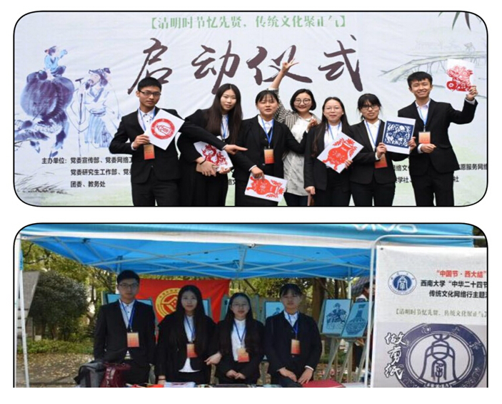 (通讯员 王华龙 )3月30日上午,以“清明时节忆先贤,传统文化聚正气”为主题的清明节活动在西南大学校庆纪念园隆重举行。williamhill中文的长江非遗学社一行7人应邀全程参与,并负责其中的习俗体验之剪纸展区。