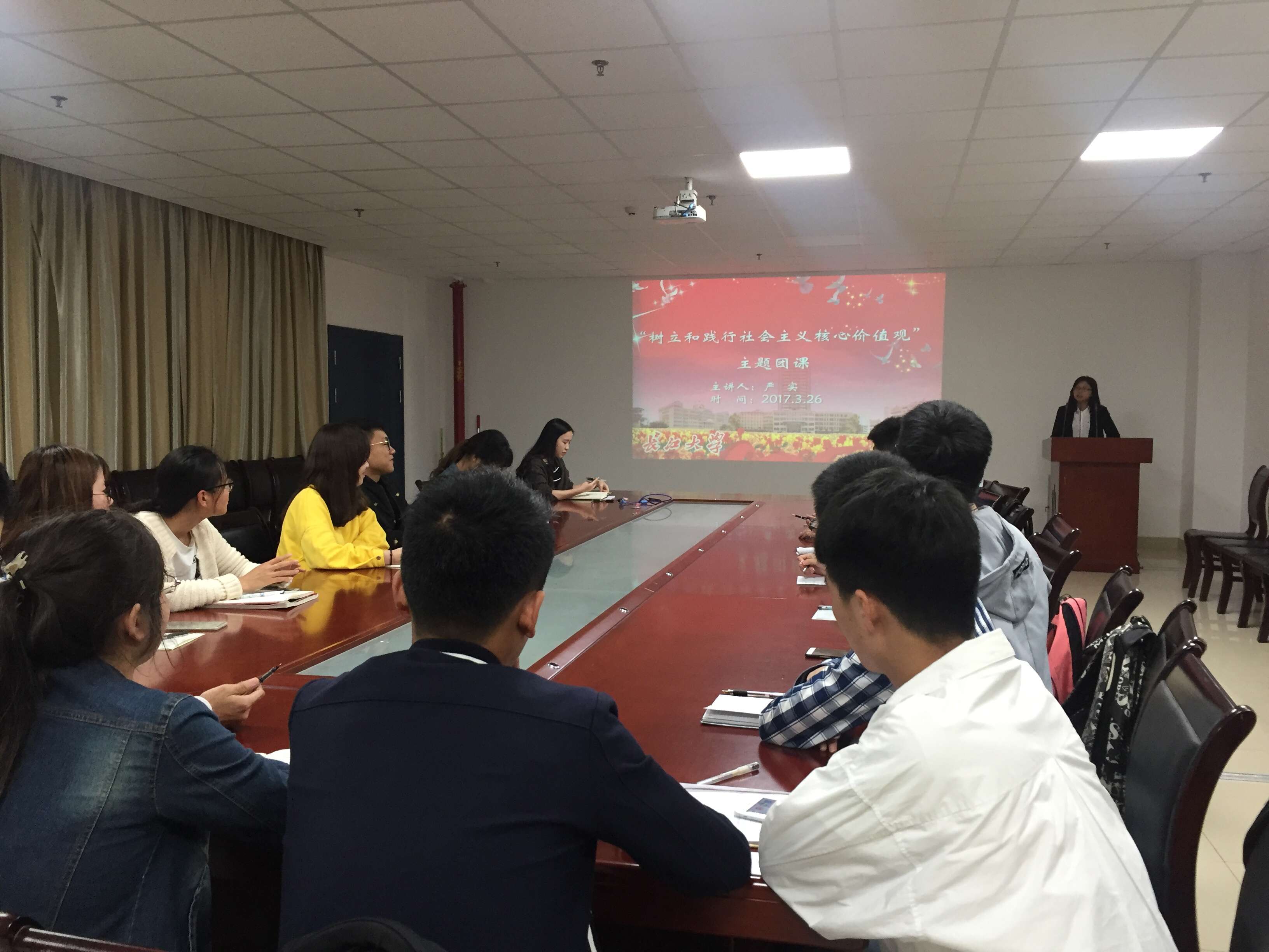 (通讯员 袁华裔)5月3日中午12时,文学院“树立和践行社会主义核心价值观”主题团会在0705会议室召开。主讲人为辅导员严实,参加会议的有文学院团委宣传部、组织部全体成员以及部分班级团支书。