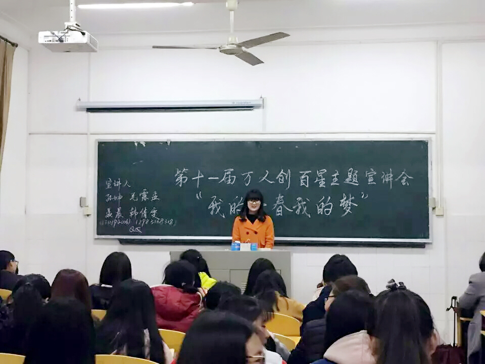 (通讯员 袁华裔)3月23日晚7时许,文学院“万人创百星”申报者的主题宣讲会在西校区2教自习室顺利进行。在黑板上铿锵有力的“我的青春我的梦”主题词下,来自文学院的14名“万人创百星”申报者分别就自己的申报项目向大一同学陈词简述,将自己的青春梦之旅娓娓道来。