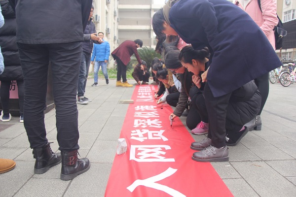 签名活动开始前,工作人员早早地将横幅、签字笔、礼品等活动物品准备妥当。不少学子满怀热情地在指定地点等候。12时整,活动正式开始。严实老师、杨雪老师和李楚昭老师率先在横幅上签上自己的名字,给我院学子树立了一个优秀的榜样形象。在老师们的带领下,同学们井然有序,依次在“一入网贷深似海,从此幸福是路人”的横幅上签上自己的姓名和班级,表示今后将提高对网贷的危机意识,形成正确的网贷观念,签完名后同学们在指定地点凭借学生证或校园卡领取小礼品。活动持续了一个多小时,横幅上满满的都是文学院学子的签名。最后,学生会全体工作人员合影留念,活动顺利结束。