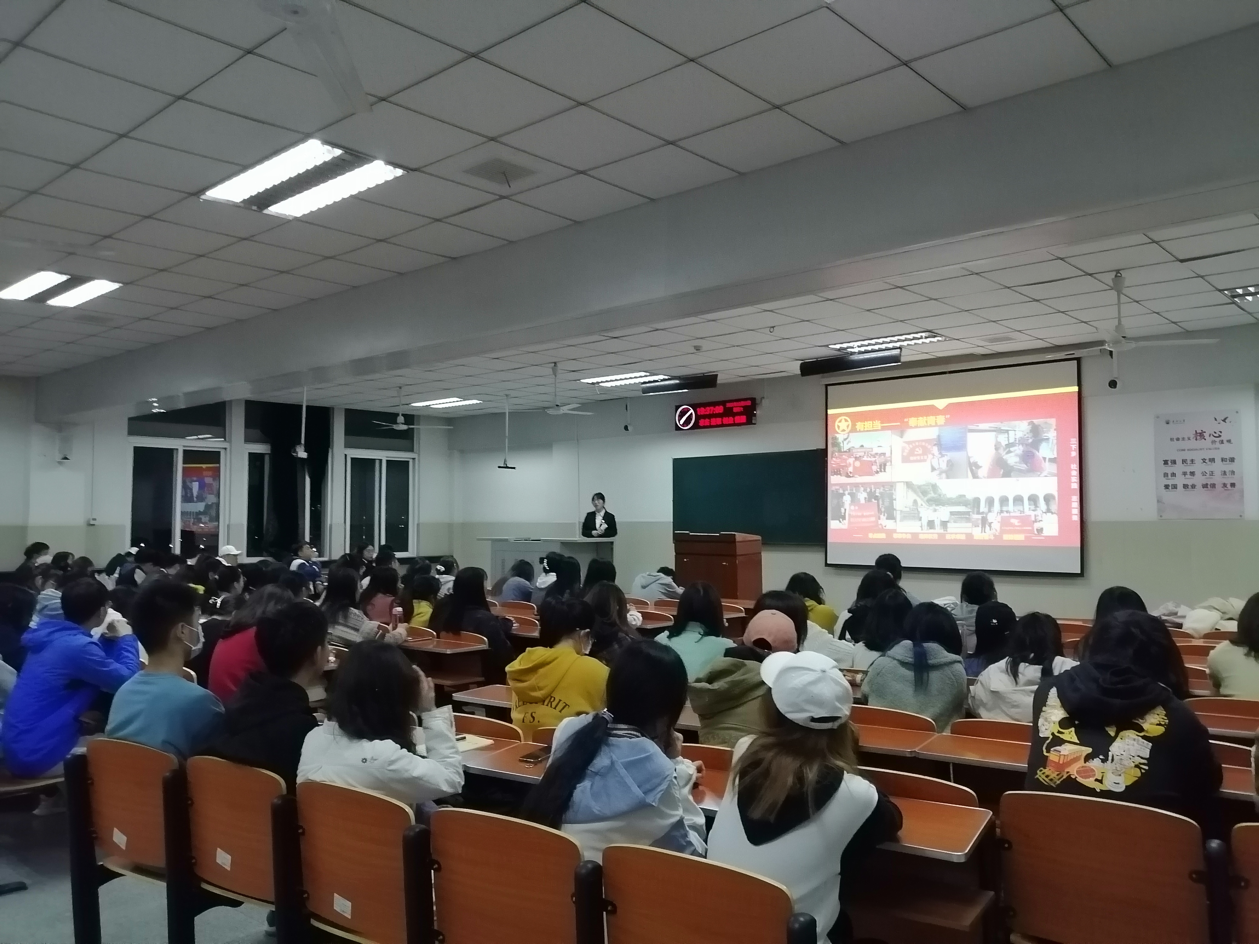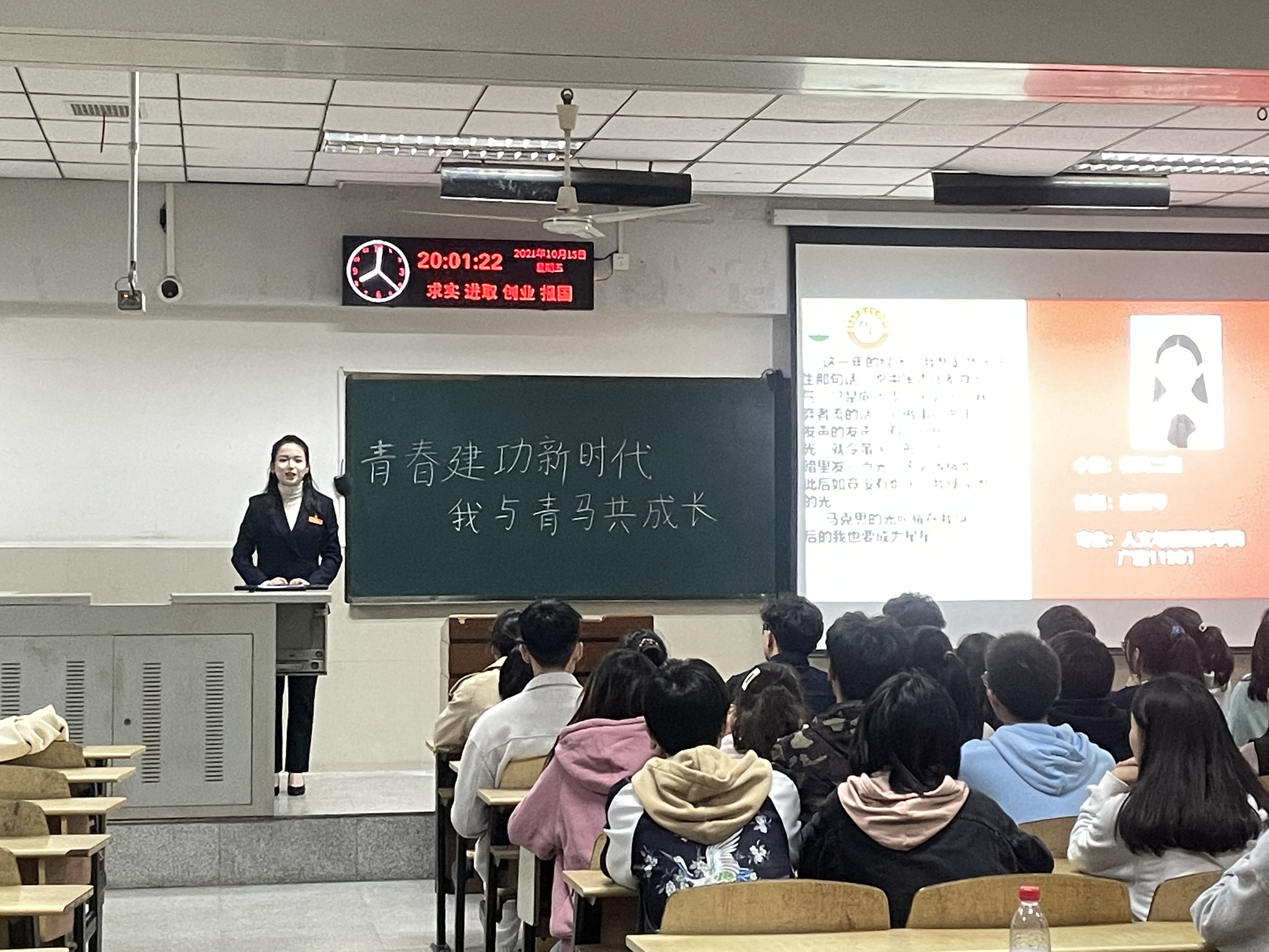 主讲人首先向在场同学介绍了青马班的发展历史以及青马班的培养目标,班级学员的主要选拔条件和培训课程等基本情况,重点开拓学员的综合素质能力,培养出既能着眼当前,又能够面向未来的青年马克思主义者,通过两年马克思主义系列主题课程的学习与实践,让学员们成长为思想上有信仰、学习上有进步、同学中有威信、能力上有提高的青年大学生精英。