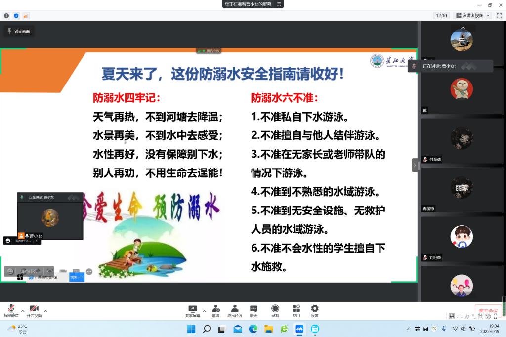 会议围绕暑假安全、防溺水、交通安全、反诈、疫情防控五个方面展开。暑假安全方面,主要强调了暑期离校和留校的相关事项,提醒同学们认真排查宿舍用水、用电等方面的安全隐患;防溺水和交通安全方面,对同学们进行防溺水的知识普及教育,提醒同学们严格遵守属地疫情防控要求,错时错峰有序安全返乡;反诈和疫情防控方面,以五大高发诈骗类案件为例,强调了反诈意识的重要性,最后对暑期疫情防控做了要求。