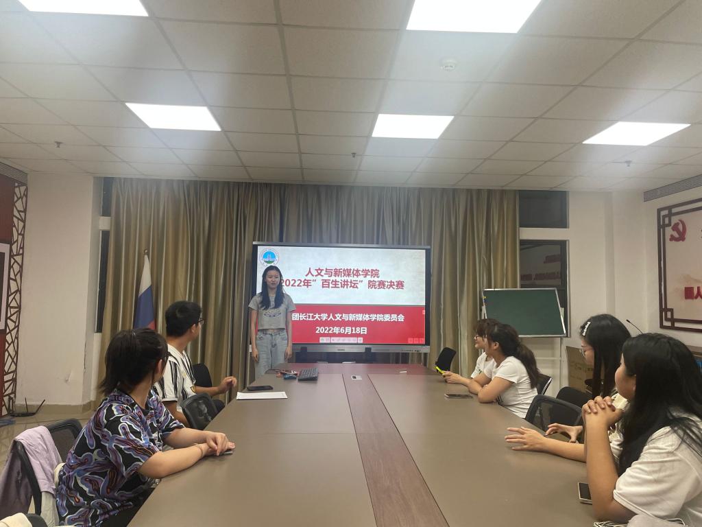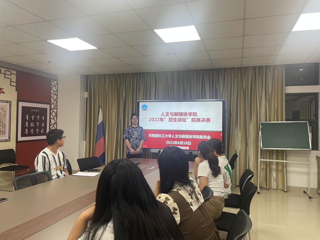 为了深化思想政治引领、提升团组织活力,进一步推进习近平新时代中国特色社会主义思想“进支部、进社团、进网络、进团课”。人文与新媒体于6月10日—18日,在文科楼701、705会议室开展“百生讲坛”院内选拔赛,学院各团支部及团员代表参加此次系列活动。
