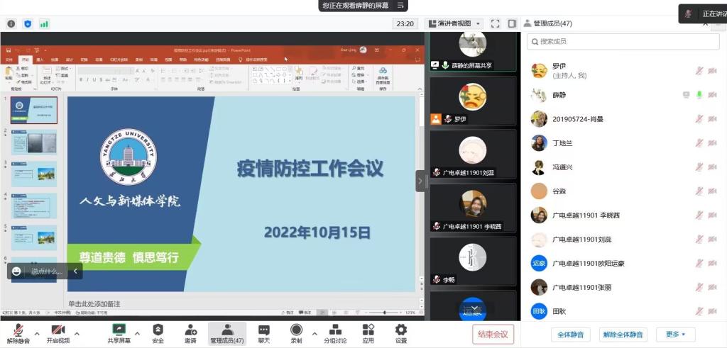 会上,胡世先对前期疫情防控工作进行了总结,并对学院疫情防控工作小组的辛勤付出与坚守表示感谢。结合当前疫情防控新形势,胡老师要求全体学工人员要提高政治站位,切实履职尽责,将防疫政策及措施及时进行传达。他表示,全体师生要积极扛起疫情防控个人责任与义务,共同守护平安长大。