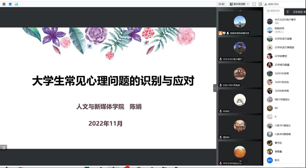 为提高学生干部对心理健康的认识,加强对心理问题的重视,11月17日,william威廉中文开展了2022年下半年新生心理骨干线上培训会。我院心理专干陈娟老师担任主讲人,2022级全体学生骨干参与此次培训。