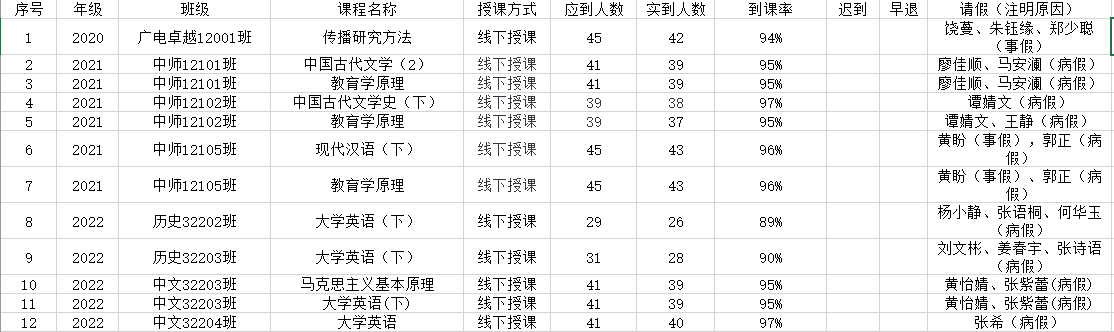 5月19日,我院组织学生干部对20、21、22级21个班的14门课程进行了34次课堂考勤,100%到课率22次,现将考勤结果公布如下: