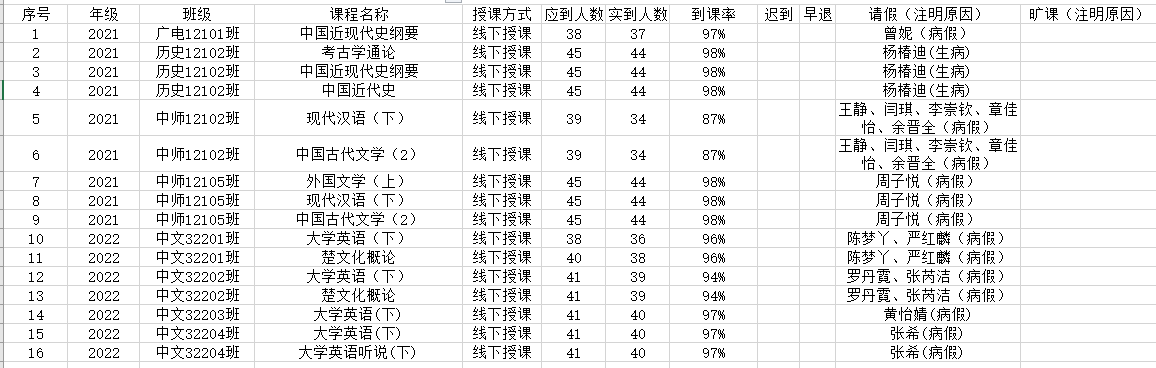 5月31日,我院组织学生干部对20、21、22级28个班的14门课程进行了55次课堂考勤,100%到课率39次,现将考勤结果公布如下: