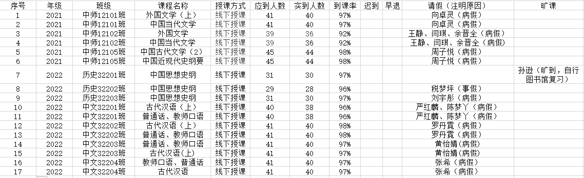 6月1日,我院组织学生干部对20、21、22级22个班的16门课程进行了36次课堂考勤,100%到课率19次,现将考勤结果公布如下: