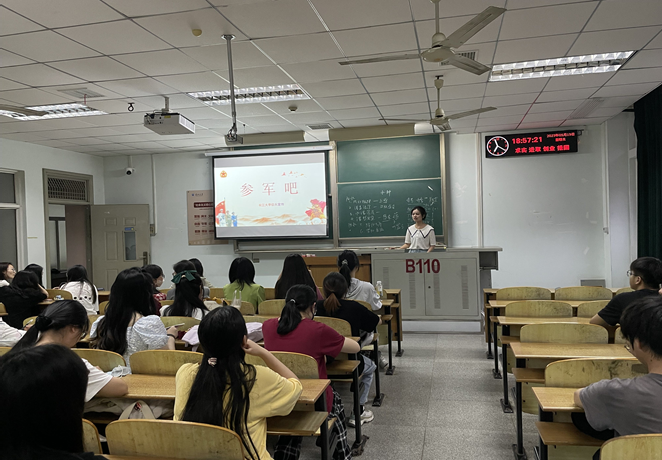 宣讲伊始,田华蓉老师引用习近平总书记给南开大学8名新入伍大学生的回信,对大学生参军的意义进行了说明。田华蓉老师满怀激情地告诉同学们:“关心国防建设是青年大学生义不容辞的责任,参军入伍是大学生实现报国志向的良好途径。”接着田华蓉老师从实际出发,列举了国家对参军入伍大学生的各项优惠政策,包括部队发展、升学优惠、经济补助等方面;最后,田华蓉老师为同学们介绍了国防相关的知识,号召青年学子心怀报效祖国、担当重任的使命感和责任感。