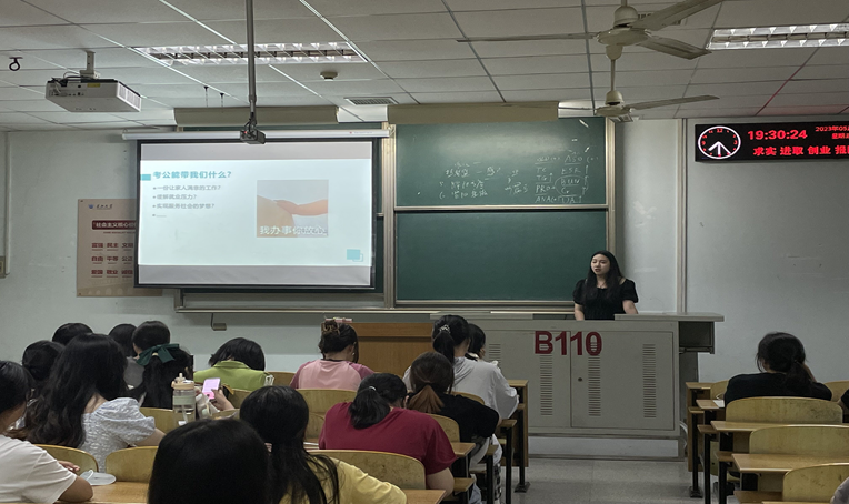 首先为同学们分享的是宋梦晗,她在2023年国考中成功上岸税务局。宋梦晗同学从宏观上帮助同学们了解了公务员的工作性质,并针对如何选择合适自己的岗位、如何报考公务员、如何高效准备公务员“行测”和“申论”两大模块提出了具体的指导和建议;其次为同学们分享的是张雨晴,该同学于2023年国考中成功上岸国税局。张雨晴同学将分享的重点放在申论的备考上,她建议同学们要以历年国家公务员考试为风向标,充分利用国家新闻官方网站,学习其新颖全面,逻辑清晰的论证过程和行文技巧,并保持对于时事政治的敏感度,提升自己的政治素养;最后为大家进行经验分享的同学是盛苗,她在2023年省考中上岸办公室综合岗,她为同学们从备考细节上提供了具体细微的备考指导。