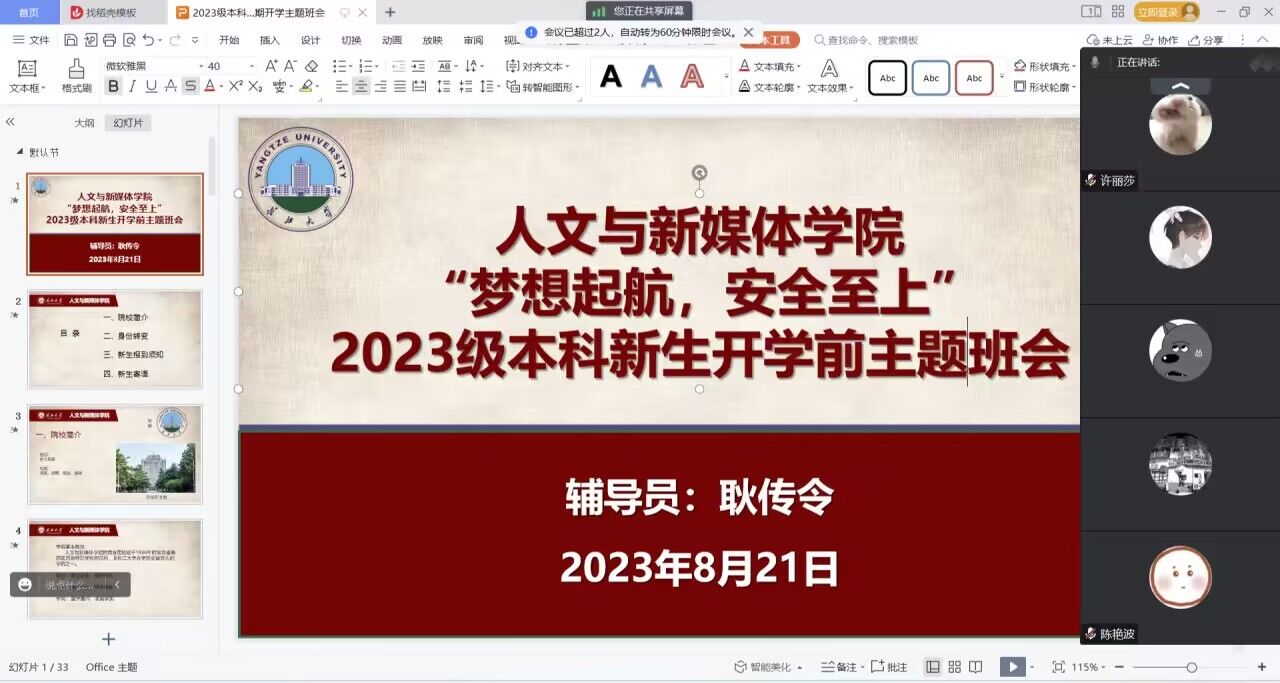 8月21至24日,我院分别组织各班级召开了“梦想起航,安全至上”为主题的2023年秋季学期开学前安全教育班会,就开学工作、安全教育、学业规划等方面进行讲解说明及要求部署。此次主题教育班会由年级辅导员、各班班主任主持,全体本科生和研究生参会。