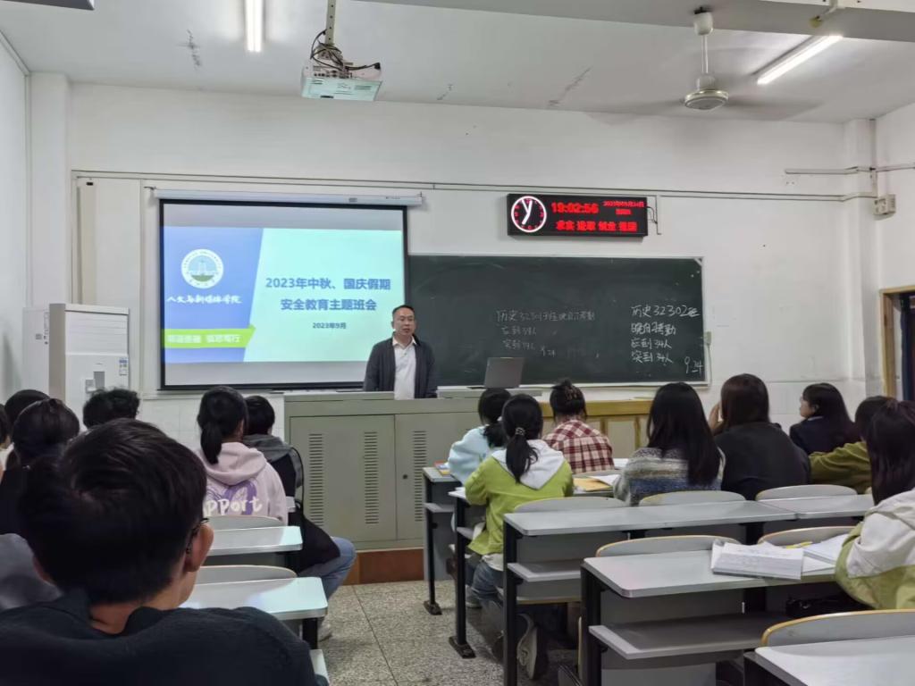 为确保中秋、国庆假期安全,提高同学们的安全防范意识,9月20日至9月26日,我院分年级在东、西校区召开了中秋、国庆假期安全教育主题班会,由各班班主任和副班长主讲。