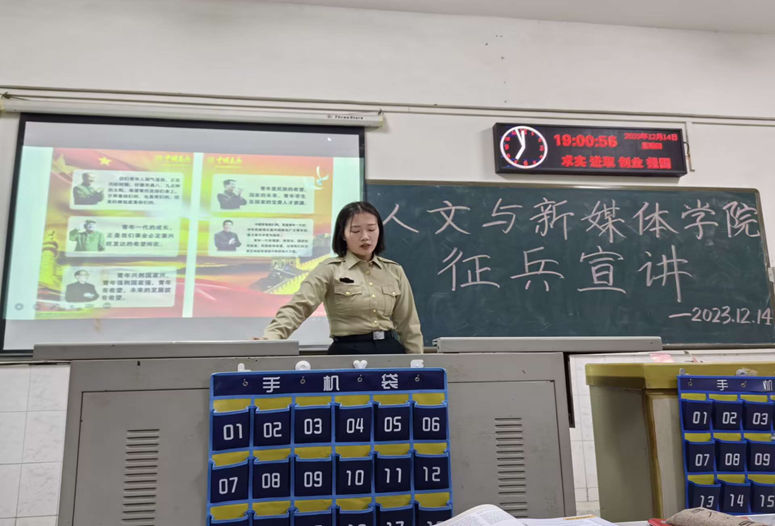 宣讲伊始,姜明圻给同学们分享了自己军营生活的点点滴滴以及参军入伍的收获和体会,重点为同学们讲解了大学生应征入伍的条件标准、应征指南和优待政策。同时,还向同学们介绍了几位学长学姐们参军入伍的经验与成长经历,并对同学们在参军入伍过程中存在的疑惑进行现场答疑。