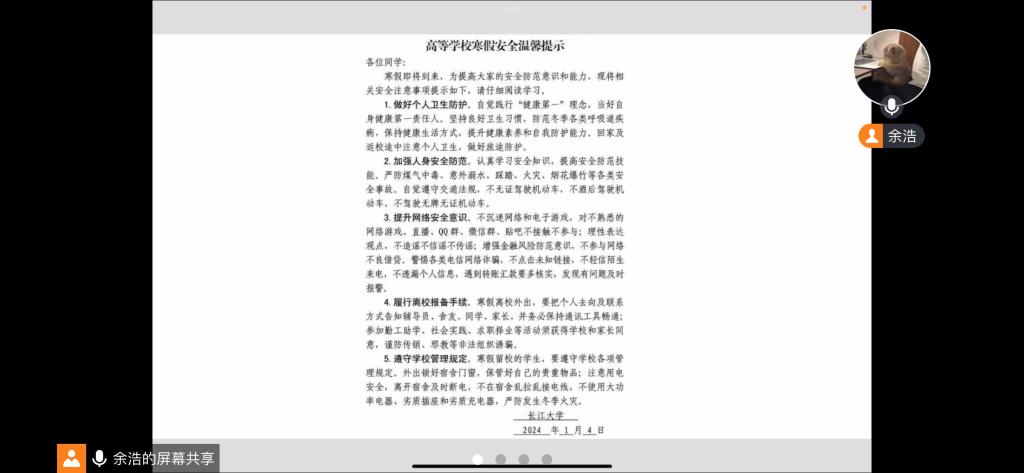 会上,各班重点开展了人身安全、交通安全、消防安全、禁止饮酒、食品卫生、电信诈骗、金融风险、网络文明等方面的安全宣传和教育,切实增强研究生的安全意识、自我防范能力和自救自护能力。同时,组织研究生认真学习《高等学校寒假安全温馨提示》并签字确认,做好寒假去向登记。