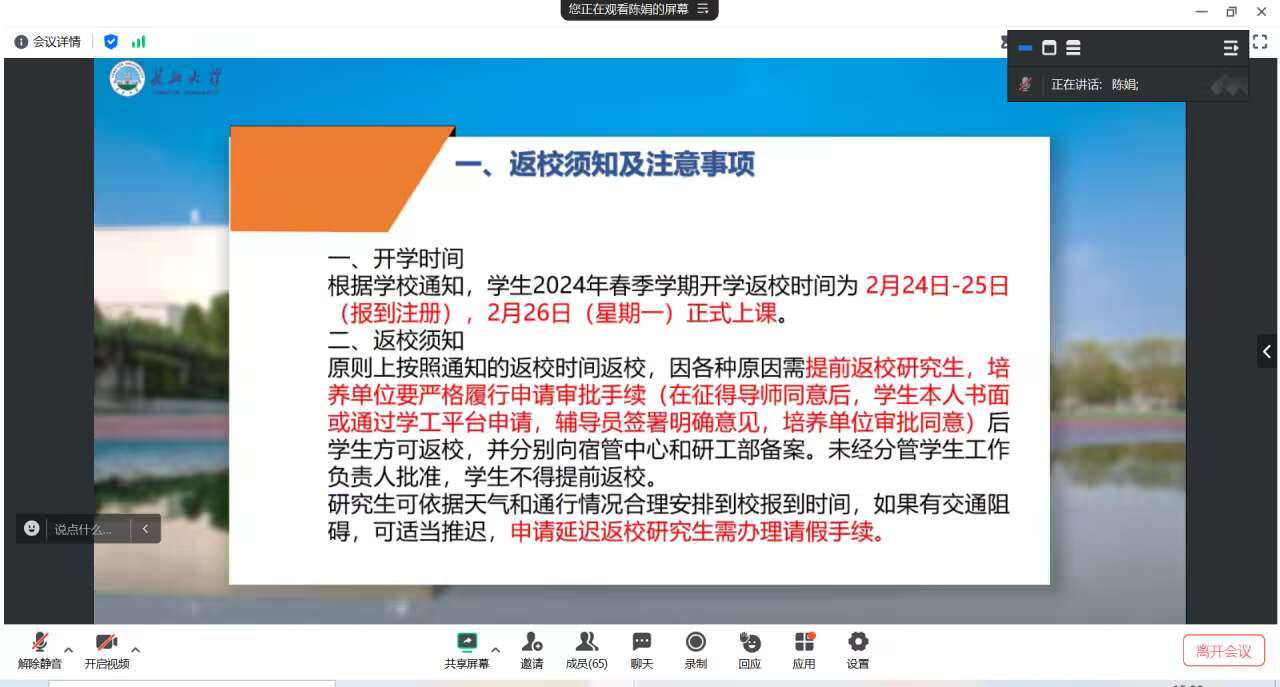 (通讯员 张兰)为应对湖北出现的寒潮大风低温雨雪冰冻天气,保障学生安全有序返校,2月21日下午,我院开展了2024年春季学期研究生开学返校安全教育主题班会,此次主题班会由陈娟老师主持,全体研究生参与。