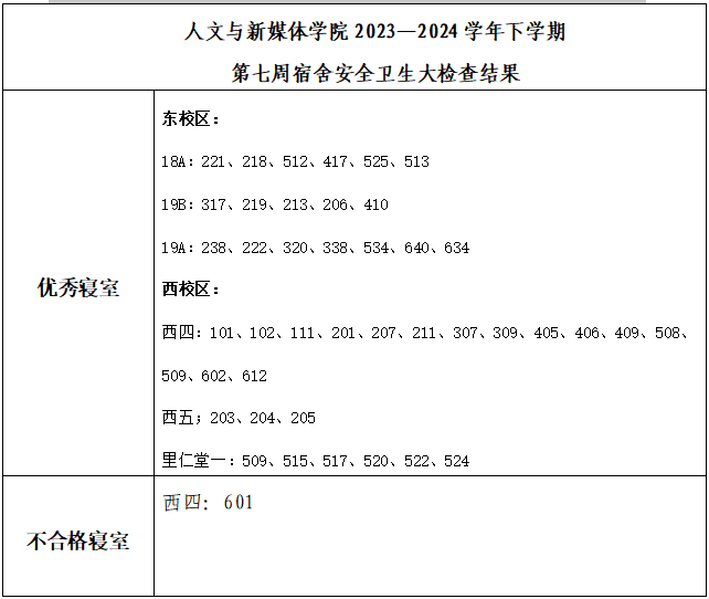 在第七周宿舍安全卫生情况检查中有1个不合格寝室,共有42个宿舍被评定为“优秀”。为规范宿舍卫生状况,经学院学工办研究,决定给予以下不合格宿舍通报批评,优秀宿舍予以通报表扬。希望各宿舍向优秀学习,优秀宿舍再接再厉,不合格宿舍做好整改工作。