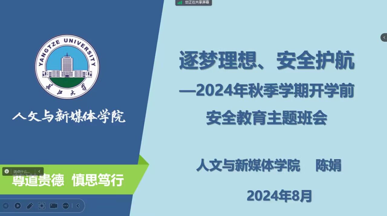 (通讯员 胡雅静)为保障学生安全有序返校,增强学生安全防范意识,引导学生尽快适应新学期生活,明确新学期目标和要求。8月22日,院召开2024年秋季学期前安全教育主题班会,全体研究生参加会议会议由研究生辅导员陈娟老师主持。