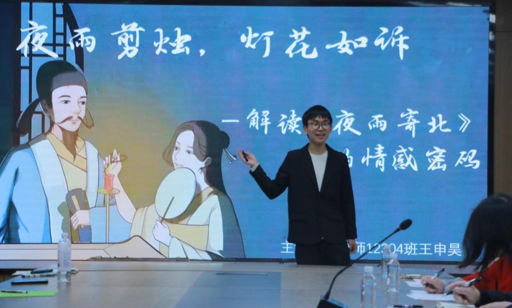 比赛现场宛若展开一幅流动的文化长卷。选手们以“意象解码”“情感图谱”“时空对话”“现实启示”等多维度切入,既有对《游园不值》看东方美学的虚实相生,又有对《定风波》“竹杖芒鞋”的哲学解读。王申昊同学与现场观众积极互动,演绎夜雨剪烛,灯花如诉,解读《夜雨寄北》的情感密码;李淼同学带着现场观众走进一场900年前的雨,看这场雨是如何淋湿苏轼的衣衫,却浇不灭他的旷达。