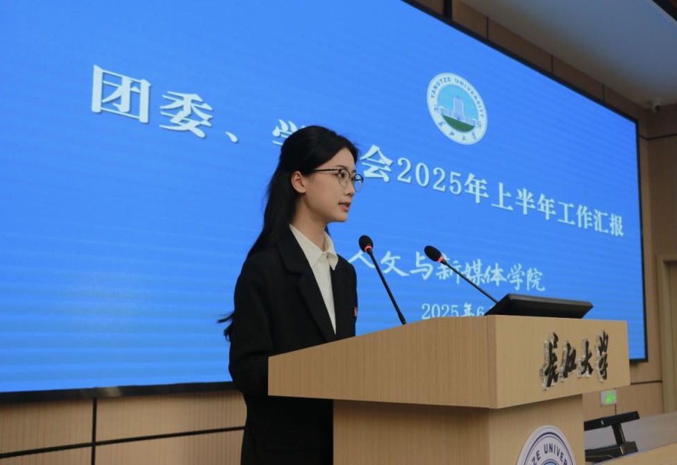 回首耕耘,经验传承。大会伊始,第二十一届学生会主席团成员邓哲今作工作报告。她系统总结了过去一年在思想引领、学风建设、安全健康、文体活动等方面取得的成果,并深刻反思了工作中的不足。她寄语新一届成员,传承“服务同学、提升自我、增强凝聚力”的宗旨,持续提升工作效能。