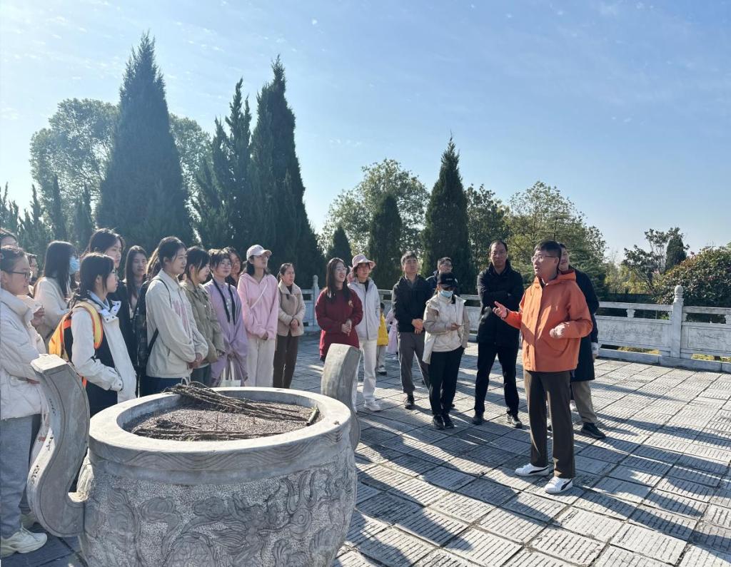 师生们首站抵达公安县孟溪镇二袁墓园。袁宗道、袁宏道、袁中道三兄弟作为明代“公安派”文学核心,以“独抒性灵、不拘格套”的文学主张影响深远。在墓园现场,李征宇教授为师生们生动讲解三兄弟的生平轶事、创作历程与思想精髓,从“反对复古、倡导革新”的文学追求,到“求真务实、体恤民生”的处世之道,让师生深刻体悟“三袁文化”的时代价值。随后,全体人员手持菊花,依次敬献、鞠躬,以庄重仪式致敬先贤,表达对文脉传承的敬意。