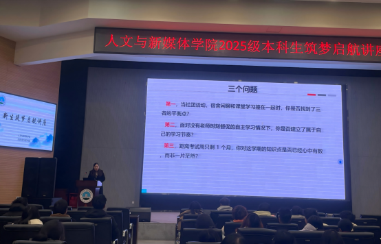 冯翠丽作总结讲话。她首先对两位老师的精彩分享表示感谢,卢老师深耕的荆楚文化研究藏着人文与新媒体专业的成长密码,向老师介绍的AI工具则是同学们提升效率的“专业助手”,鼓励新生既要扎根传统文化土壤,传承楚人开拓进取的精神品质,也要保持开放心态,主动拥抱科技变革,在人文与科技的融合中找准自身定位。最后她以“三月积淀,蓄力应考”为题,精准指出新生学习生活中存在的三个关键问题,并针对性地提出三个建议,希望同学们进一步凝心聚力,合理规划时间,查漏补缺,以扎实的学业为大学生涯奠定坚实基础。
