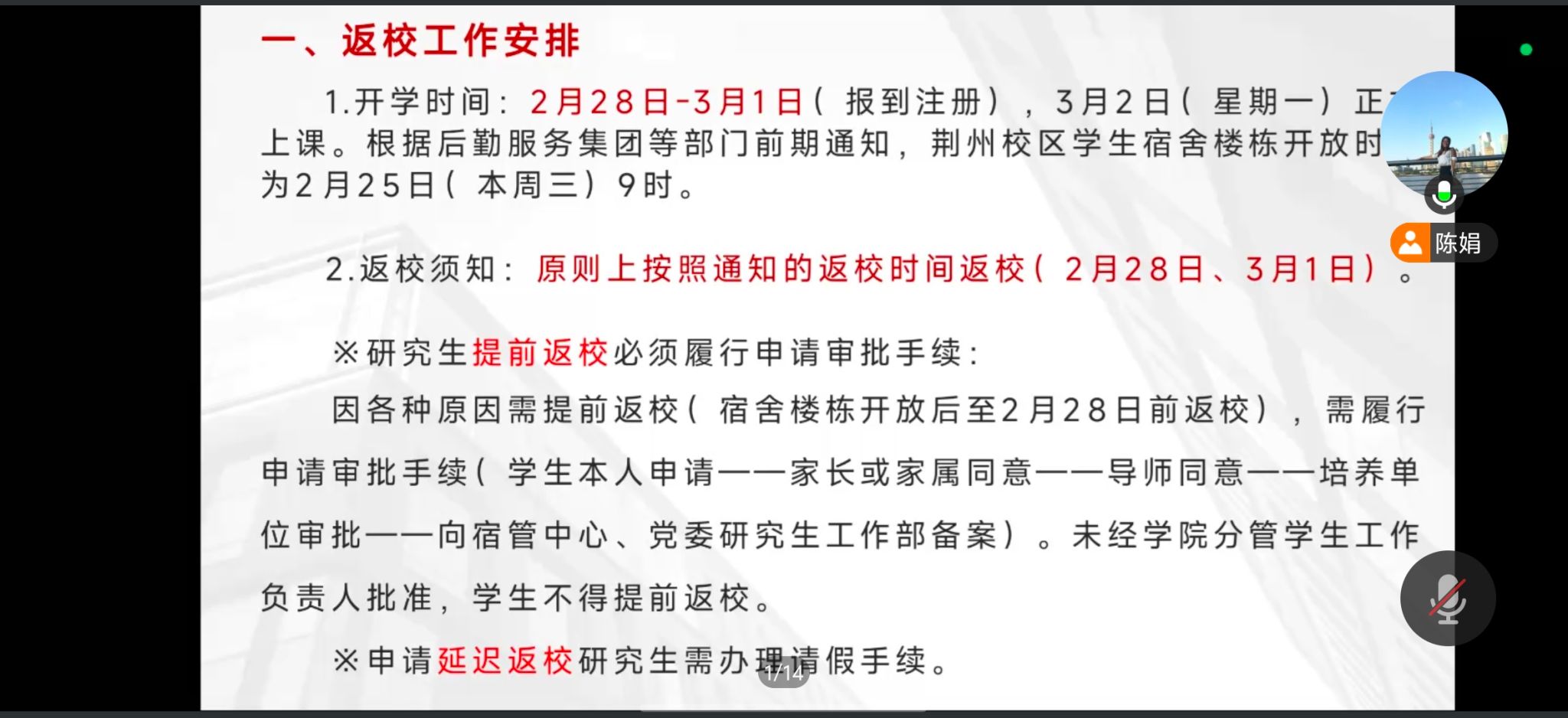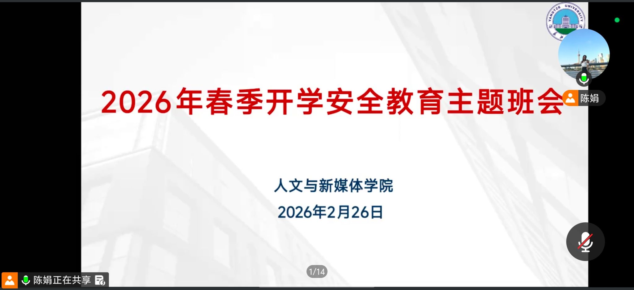 春光作序,研途启新。为筑牢春季开学安全防线,保障研究生返校顺利与校园生活安全,2月26日,学院组织开展2026年春季开学安全主题班会,研究生辅导员陈娟主讲,全体研究生线上参与,共同聆听开学安全“第一课”。