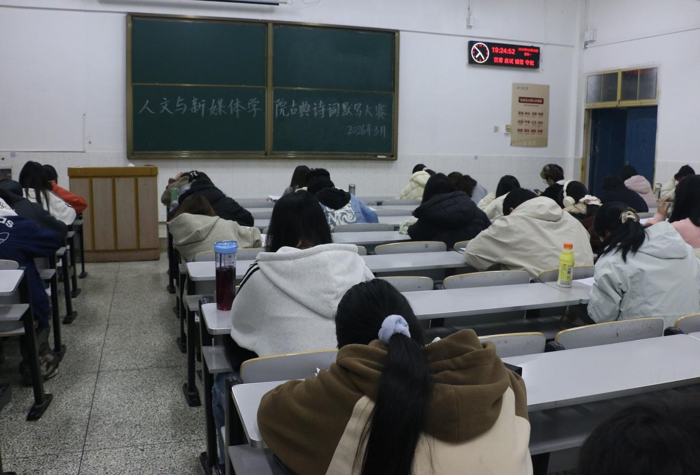 (文/李晨摄/马绮悦 宋子墨)为深入落实立德树人根本任务,扎实推进文化育人工作,传承中华优秀传统文化,营造勤学善思、书香浸润的优良学风,3月30日晚7点,我院在西校区5教115教室、东校区13教C117教室同步举办古典诗词默写比赛,2024级、2025级本科学生近百人参赛。