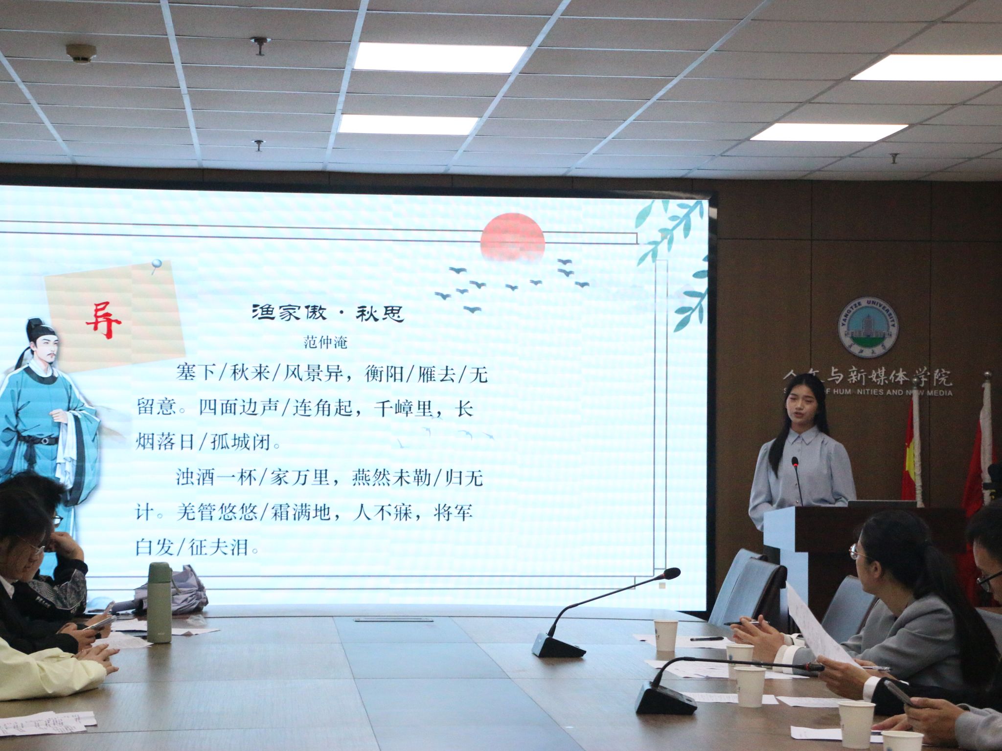赏析内容兼具深度与温度:既有蒋捷听雨的岁月感怀,亦有岑参咏雪的真挚情谊;汪名荣同学以士大夫精神为切入点,深刻阐释《渔家傲・秋思》中的报国热忱与戍边坚守;余秋雨同学借《登岳阳楼》雄浑气象,探寻杜甫晚年不移的家国情怀;陶香颖同学立足专业视角,以新闻思维品读红色诗词,赋予经典全新时代解读。