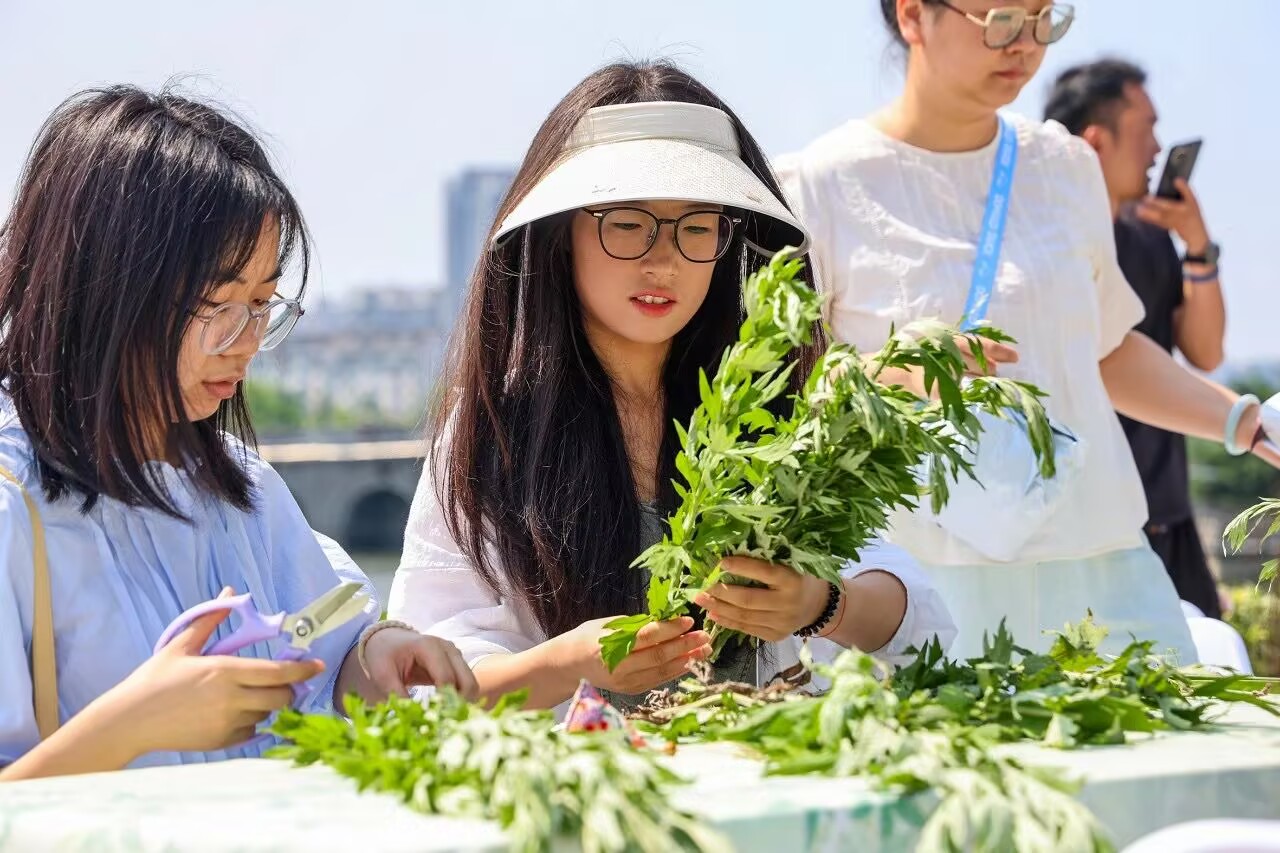在民俗体验区,队员们带领市民包制棱角分明的楚粽、清香扑鼻的艾草粑,编织象征吉祥的五彩绳。射五毒活动中,弓箭对准毒物图案的刹那,古老驱疫习俗焕发新生机;编五彩绳的活动也吸引了众多游客,参与人员互相交流编织技巧,将五彩的丝线编织成精美的手链,寓意着祈福和辟邪;香囊制作环节更成为流动的文化课堂,一针一线间传递着“佩帏辟邪”的千年智慧。