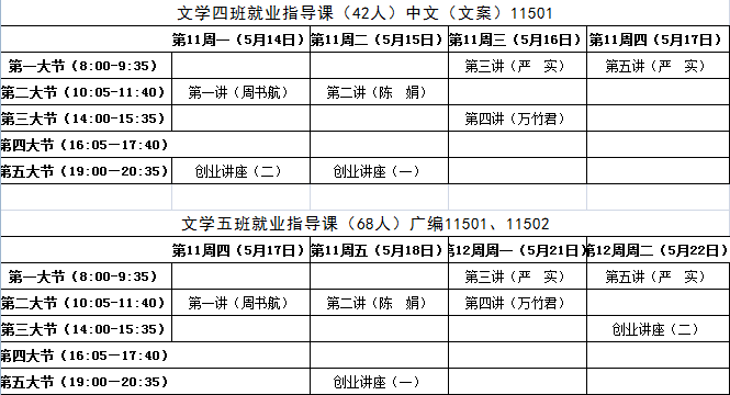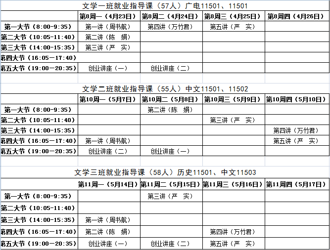 文学院2018届各毕业班级: 按照教务处教学计划安排,近期将在2018届各毕业班级开设《就业指导》课。课程统一安排在8-12周,共计十四个课时。现将具体安排通知如下: 课程内容: 第一讲 基本的职业礼仪 第二讲 大学生职业生涯规划 第三讲 面试策略 第四讲 毕业手续办理及注意事项 第五讲 求职材料的准备 第六讲、第七讲 创业培训 分班及课程安排: