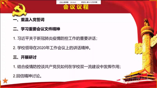 本次会议分四项议程进行。会议伊始,张恒同志带领全体成员重温入党誓词。会议第二项,新闻历史学生党支部陈娟老师带领全体党员学习重要会议文件精神,党员同志们对疫情防控工作的认识进一步深化,增强了“战疫”决心和责任感。