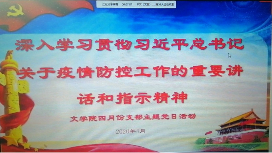 4月13日晚7时,文学院新闻和历史专业联合学生党支部、中文专业学生党支部在线上以视频会议的形式召开4月份支部主题党日活动,此次活动的主题是“深入学习贯彻习近平总书记关于疫情防控工作的重要讲话和指示精神”。文学院党委副书记胡世先老师出席会议,全院学生党员准时到会,本次活动由殷友豪同志主持。
