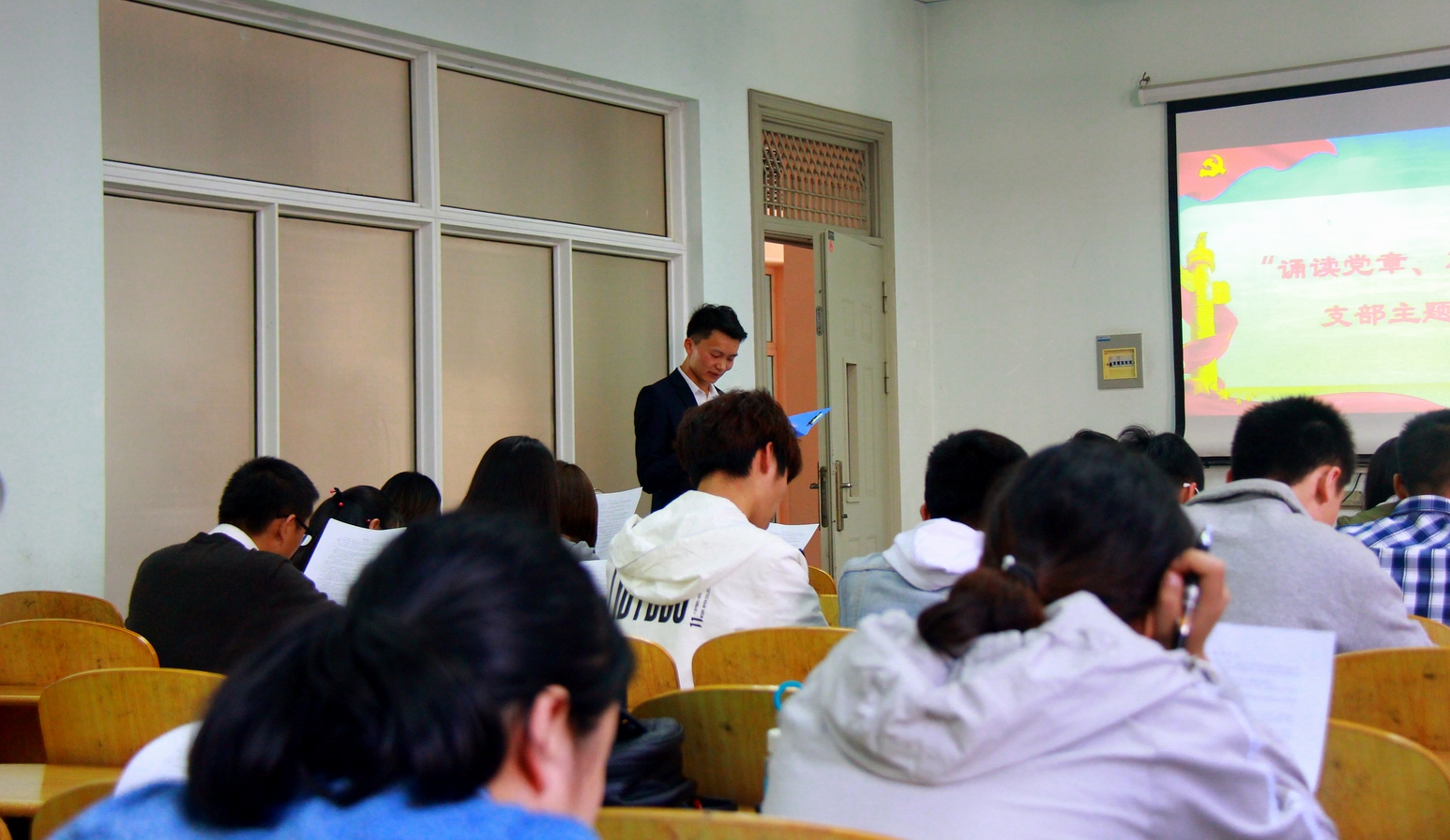(通讯员  殷友豪)4月13日下午,文学院新闻历史学生党支部在13教B109开展了“诵读党章、加强整改”主题党日活动。新闻历史学生党支部书记陈娟以及支部党员参加了此次会议。
