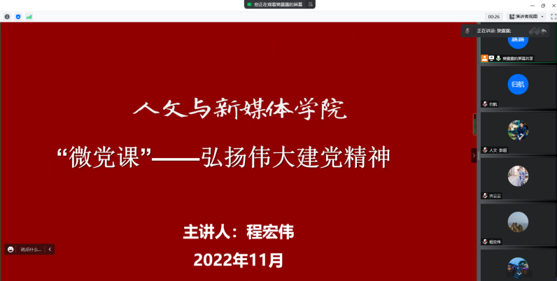 课上,程宏伟从党的二十大主题引起,对习近平总书记在中国共产党成立100周年大会上的讲话中提出伟大建党精神内涵进行了剖析解读。
