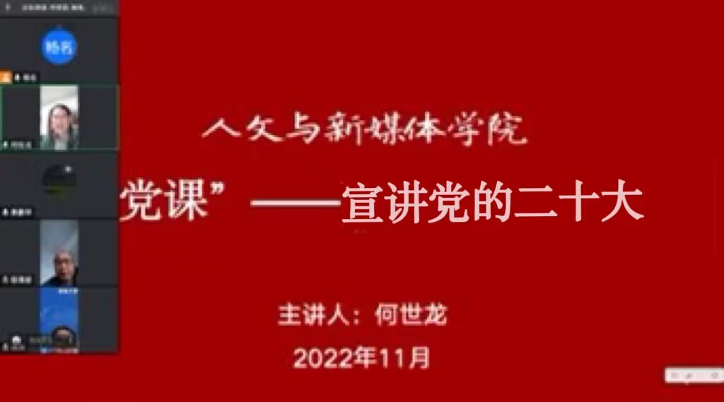 为积极响应党员干部“下基层察民情解民忧暖民心”实践活动,引导教师党员进一步学习贯彻党的二十大精神,1128日,学院院长何世龙以“党的二十大精神”为主题,为中文专业教工党支部作主题党课。