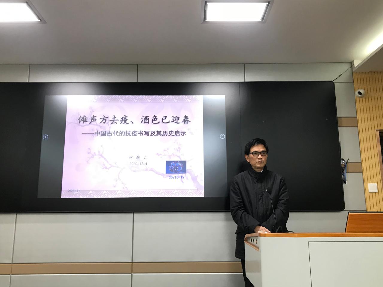 (通讯员 钱海丽)12月4日下午,文科大楼910会议室座无虚席。湖北大学文学院二级教授、中国古代文学专业博士生导师何新文老师做客“长江人文讲坛”,为大家带来题为“‘傩声方去疫,酒色已迎春’——中国古代的抗疫书写及其历史启示”的讲座。学院副院长李征宇老师担任主持人,吴桂美、罗勋章、刘砚群、袁咏心等教师以及近九十名本科生和研究生一起聆听了此次学术讲座。