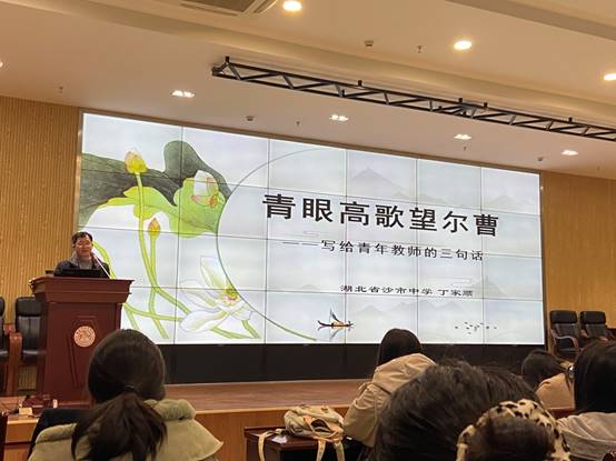 稍作休息后,沙市中学资深语文教育专家丁家顺老师,向同学们做了《青眼高歌望尔曹——写给青年教师的三句话》的讲座,以一个从教三十八年的资深教师的经历,向大家讲述了作为一名班主任和一名语文教师所做遇到的各种问题及应对的方法,充分体现了丁老师对教育的使命感、责任感,也让大家认识到作为一名教师必须有爱心、耐心和细心。听了丁老师充满激情的讲解和生动感人的案例,同学们纷纷表示受益匪浅。