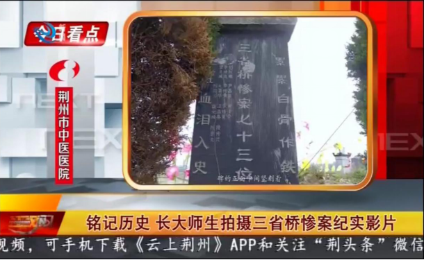 9月3日,为庆祝中国人民抗日战争胜利暨世界反法西斯战争胜利75周年,荆州广播电视台《江汉风》特别推送了由我院师生摄制的纪录片《三省桥惨案纪实》。该片由教师罗威导演,孙策、刘云庆、张建坤、冯婷婷四名广播电视编导专业学生创作完成。该片以口述历史的形式,清晰写实地还原了三省桥惨案的原貌,意义深远,影响重大。
