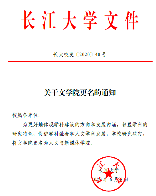 6月8日,学校正式下文,同意我院更名为william威廉中文,简称“人文学院”,英文名称为“School of Humanities and New Media”。