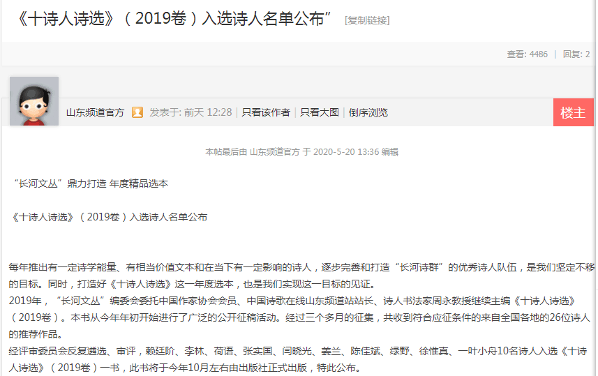 2020年5月20日,中国诗歌官方在线公布了《十诗人诗选》(2019年)入选诗人名单,我院中文(师范)11702班徐惟真同学的30首诗歌成功入选。此书由“长河文丛”编委会委托中国作家协会会员、中国诗歌在线山东频道站站长、诗人书法家周永教授主编,将由山东音像出版社于今年10月左右正式出版,出版后的书籍也将在新华书店的推荐上架进行销售。据悉,“长河文丛”由专业编辑和设计团队倾心锻造,与国家级重点出版社线装书局、山东画报出版社、黄河出版社等联合出版,CIP版本数据可查。