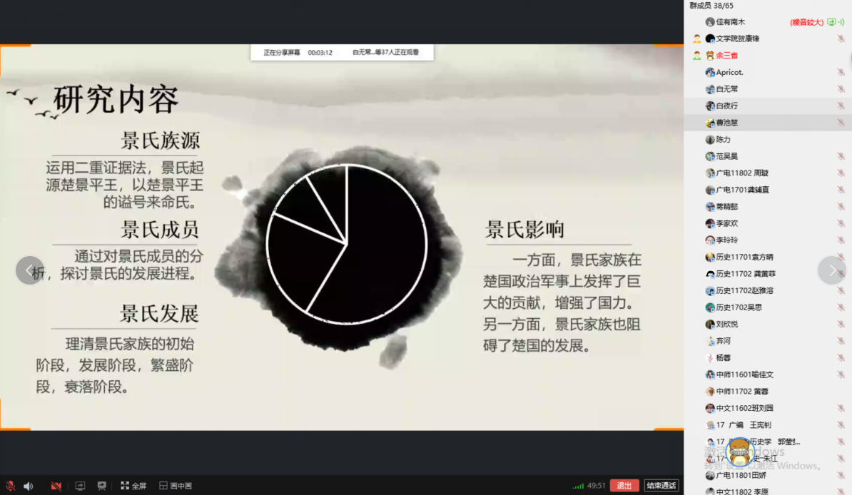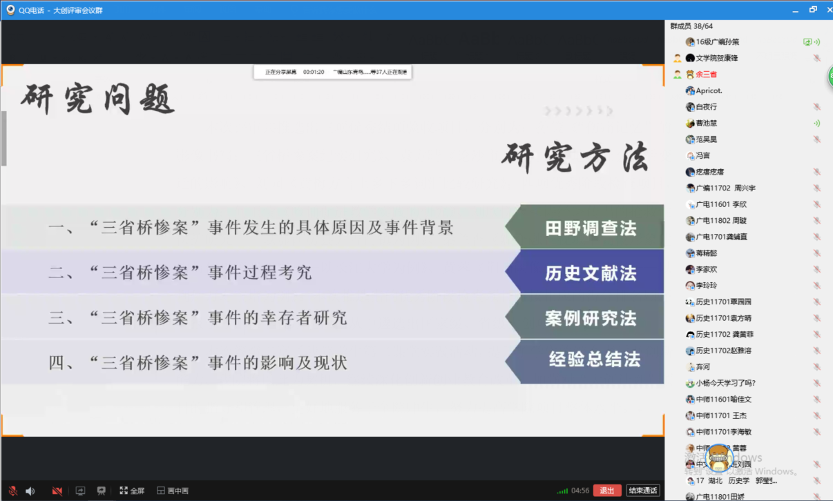 5月11日18:30——22:00,文学院2020年度校级“大学生创新创业训练计划”项目结项验收与阶段检查评审答辩会以网络视频会议的方式举行。本次共有11个结项验收项目与14个阶段检查项目参加答辩,我院教师余静贵、杨蓉、曹池慧、余劲东担任评委。