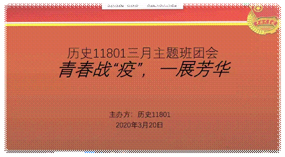 历史11801团支部班长张兰组织了此次班会,表示目前疫情已大有好转,但是没有到胜利的那一刻,我们不能松懈,为了让疫情早日结束和维护同学们的切身利益召开此次班会,班会传达了学校的文件,告知同学们,没有学校通知,坚决不可提前返校。会议主要通过组织全体同学以习近平总书记勉励北京大学援鄂医疗队全体90后党员的回信为主要内容,观看影像。