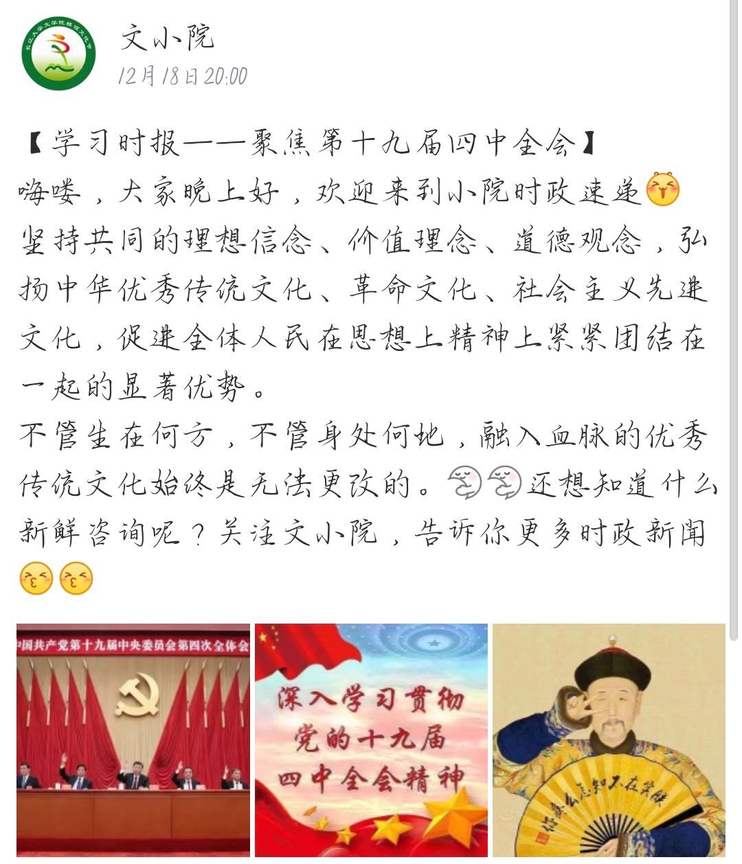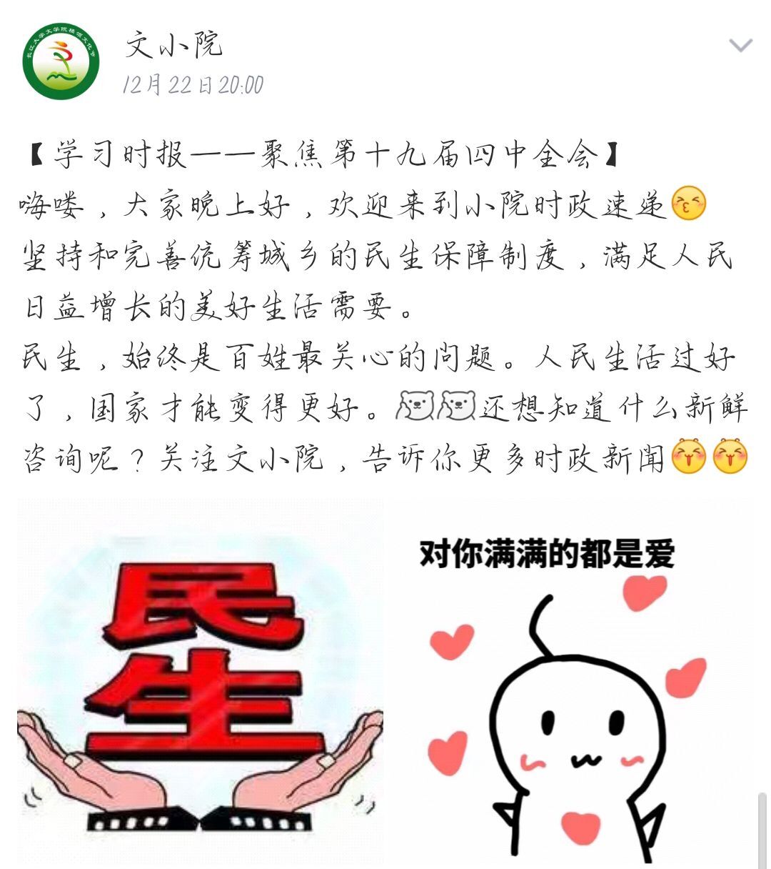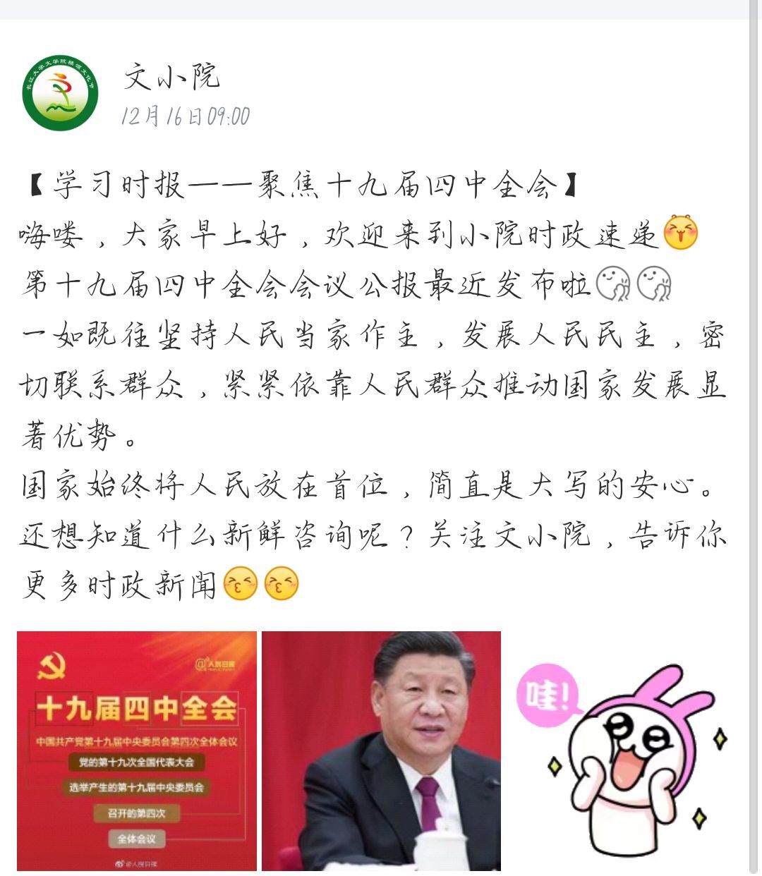 为深入学习宣传贯彻党的十九届四中全会精神,近日,williamhill中文文学院官方QQ及微信公众号开展了以【小院带你走进不一样的十九届四中全会】为话题的宣传活动。本次活动采用学生喜闻乐见、易于接受的线上宣传与线下互动双向交流的方式,给文学院全体师生深入学习党的十九届四中全会精神带来了不一样的体验。