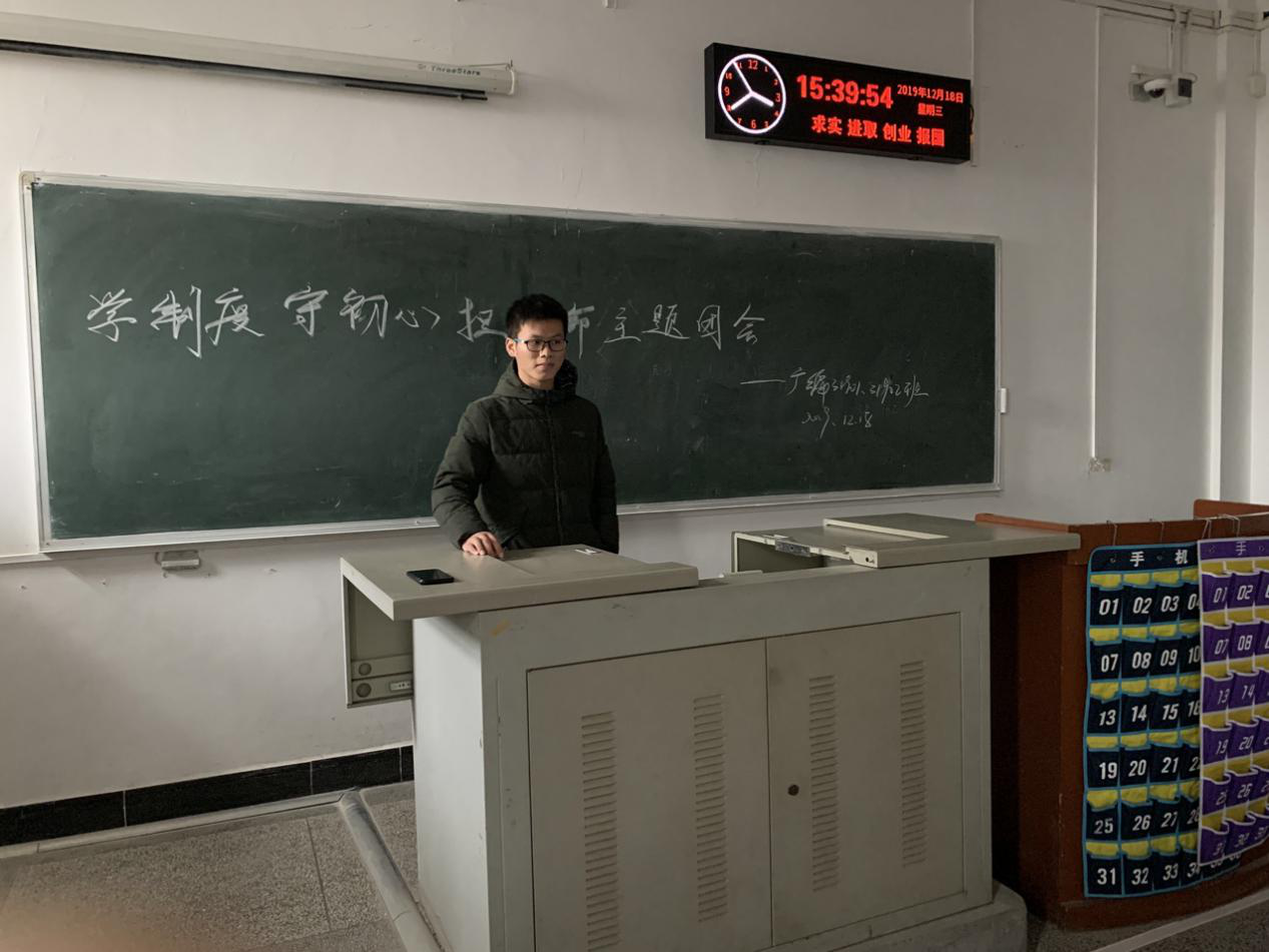 文史31902班12月“学制度,守初心,担使命”主题团会在二教成功举办。本次团会分为三部分,唱团歌,通读重要讲话,观看专家辅导报告。通过不同的活动形式,使“学制度,守初心,担使命”的理念深入人心。